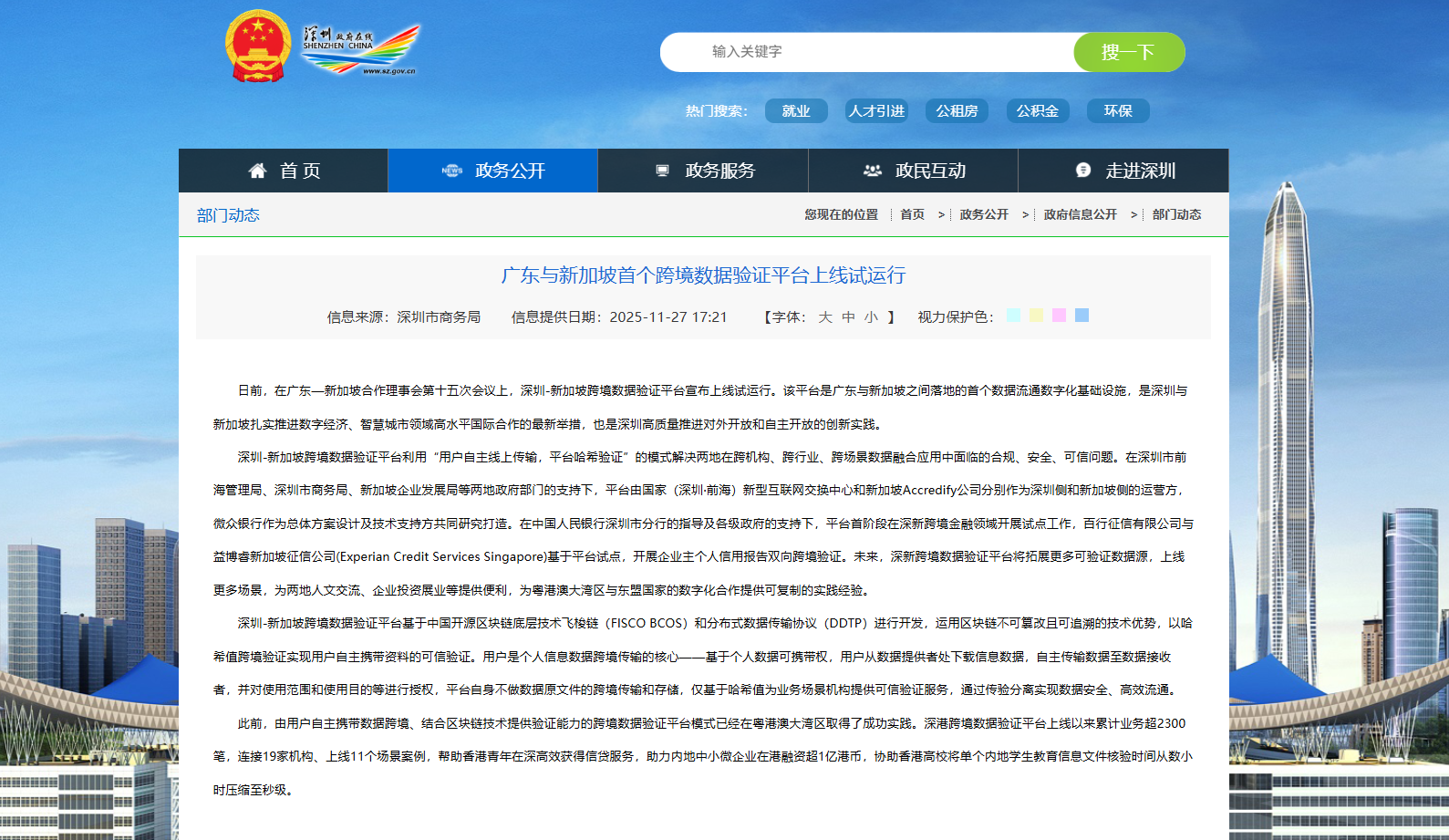 深圳-新加坡跨境数据验证平台利用“用户自主线上传输,平台哈希验证”的模式解决两地在跨机构、跨行业、跨场景数据融合应用中面临的合规、安全、可信问题。在深圳市前海管理局、深圳市商务局、新加坡企业发展局等两地政府部门的支持下,平台由国家(深圳·前海)新型互联网交换中心和新加坡Accredify公司分别作为深圳侧和新加坡侧的运营方,微众银行作为总体方案设计及技术支持方共同研究打造。在中国人民银行深圳市分行的指导及各级政府的支持下,平台首阶段在深新跨境金融领域开展试点工作,百行征信有限公司与益博睿新加坡征信公司(Experian Credit Services Singapore)基于平台试点,开展企业主个人信用报告双向跨境验证。未来,深新跨境数据验证平台将拓展更多可验证数据源,上线更多场景,为两地人文交流、企业投资展业等提供便利,为粤港澳大湾区与东盟国家的数字化合作提供可复制的实践经验。